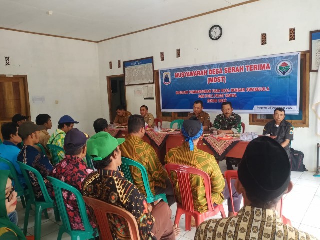 Gemasiber80news.com, LEBAK – Kepala Desa (Kades) Sogong Hasanudin dan Babinsa 0314/Panggarangan Kodim 0603 Lebak Serka Asmar mengahadiri giat Musyawarah Desa Serah Terima (MDST) kegiatan pembangunan fisik desa dengan swakelola dan pola padat karya tahun 2022, turut hadir Sekdes,ketua BPD,LPM,tokmas dan lainnya bertempat diaula kantor desa Sogong kecamatan panggarangan kabupaten lebak provinsi banten Senin (26/12/2022)