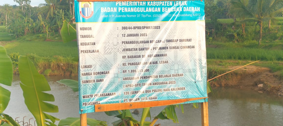 Saat dikonfirmasi Kepala Desa Hegarmanah Apid Hamidi (Jaro Apid) membenarkan bahwa Pak Asda 2 Ajis dan Kalak BPBD Kabupaten Lebak Peby, bersama pak Camat Ahmad Faidlullah dan jajaran meninjau lokasi pembangunan jembatan yang saat ini sedang dikerjakan oleh rekanan yaitu PT Bumen Jaya Abadi dengan anggaran mencapai 1,8 Milyard lebih, ujar Jaro Apid.