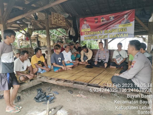 Gemasiber80news.com, LEBAK – Guna menjalin talisilahturahmi Kepala Kepolisian Sektor Bayah Resor Lebak Iptu Syamsu Riyanto didampingi Bhabinkamtibmas Brigadir Eka Trisna Serta Bhabinkamtibmas Brigadir Ruston Melaksanakan Program Kapolri Jum’at Curhat dengan mendengarkan langsung keluhan warga masyarakat yang bertempat di desa Bayah Barat, kecamatan Bayah, Kabupaten Lebak. Jum’at (17/2/2023).