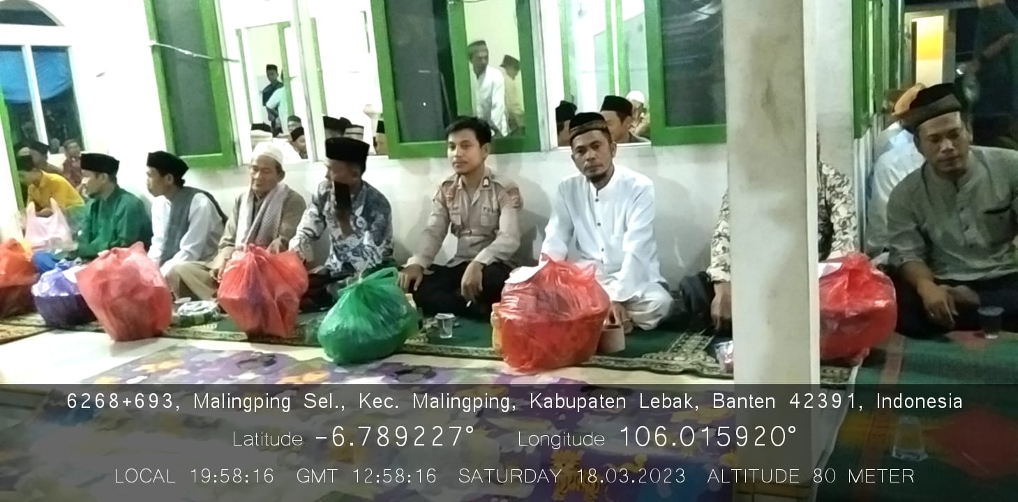 Gemasiber80news.com, LEBAK – Bhabinkamtibmas Polsek Malingping Polres Lebak Brigadir Togu Hadiri pengajian bulanan tingkat Desa sekaligus penutupan pengajian menjelang Bulan Suci Ramadhan di Kampung Sukamulang Desa Sukaraja Kecamatan Malingping Kabupaten Lebak, Sabtu malam (18/3/2023)