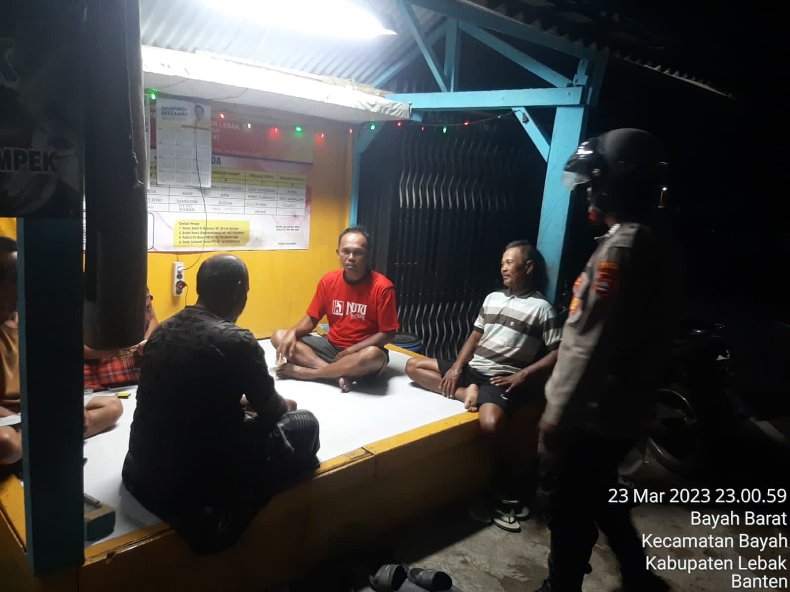 Gemasiber80news.com, LEBAK – Guna tetap menumbuhkan kesadaran warga di wilayah kecamatan Bayah tentang pentingnya pelaksanaan Siskamling, Kanit Binmas Polsek Bayah Polres Lebak Bripka Sutardi di dampingi Bhabinkamtibmas Brigadir Dedi Supriyadi melaksanakan sambang dialogis dan cek petugas Pos Kamling di Kampung Bayah I, desa Bayah Barat, kecamatan Bayah, Kabupaten Lebak, Provinsi Banten Jum’at (24/3/2023).