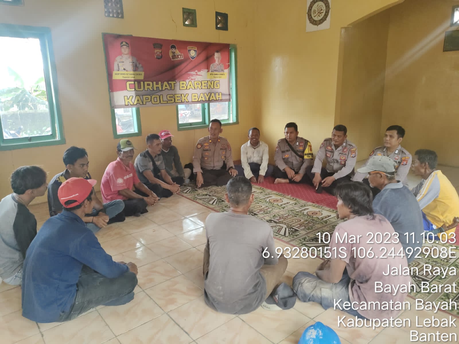Gemasiber80news.com, LEBAK – Guna mendengarkan Keluhan Warga dan juga menindaklanjuti Program Kapolri Kapolsek Bayah Polres lebak Iptu Syamsu Riyanto didampingi Kanit Binmas Bripka Sutardi, Kspk Polsek Bayah Bripka Agus Sofyan, Bhabinkamtibmas Brigadir Eka Trisna serta Bhabinkamtibmas Brigadir Ruston Lumintang Gelar Jum’at Curhat dengan mendengarkan Keluhan warga masyarakat desa Bayah Barat, kecamatan Bayah, Kabupaten Lebak. Jum’at (10/3/2023).