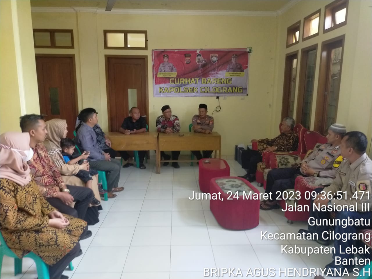 Hadir di kegiatan “Jum’at Curhat” Kapolsek Cilograng AKP Asep Dikdik, Bripka Agus Hendriyana dan Briptu Danu Rahmad Bhabinkamtibmas, Ketua Korwil Pendidikan dan Anggota Korwil Pendidikan Kecamatan Cilograng.