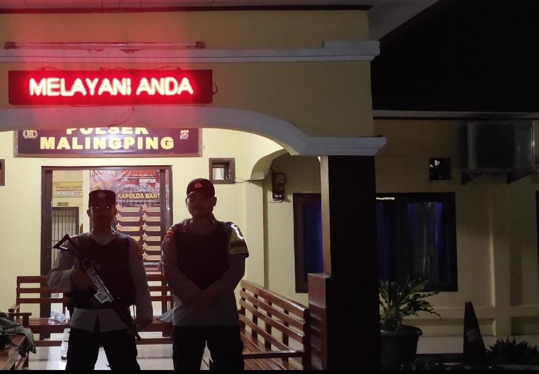 Pengamanan dilakukan ditempat pintu masuk maupun di halaman Mapolsek Malingping dengan sikap siap siaga yang dilengkapi sarana pendukung berupa senjata api laras panjang dan rompi anti peluru.