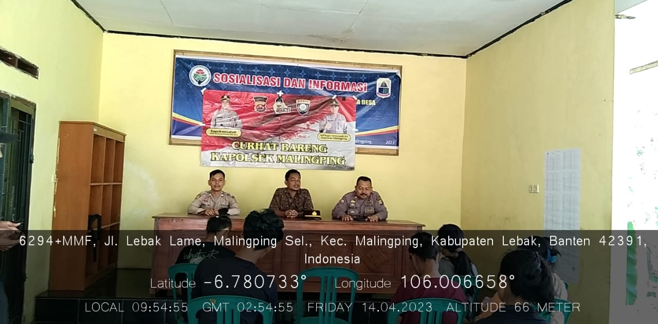 Gemasiber80news.com, LEBAK – Guna mendengar keluhan kesah maupun masukan dari Warga Masyarakat terkait Harkamtibmas, Polsek Malingping Polres Lebak melaksanakan program “Jumat Curhat” dengan Warga Desa Malingping selatan Kecamatan Malingping Kabupaten Lebak Jum’at (14/4/2023).