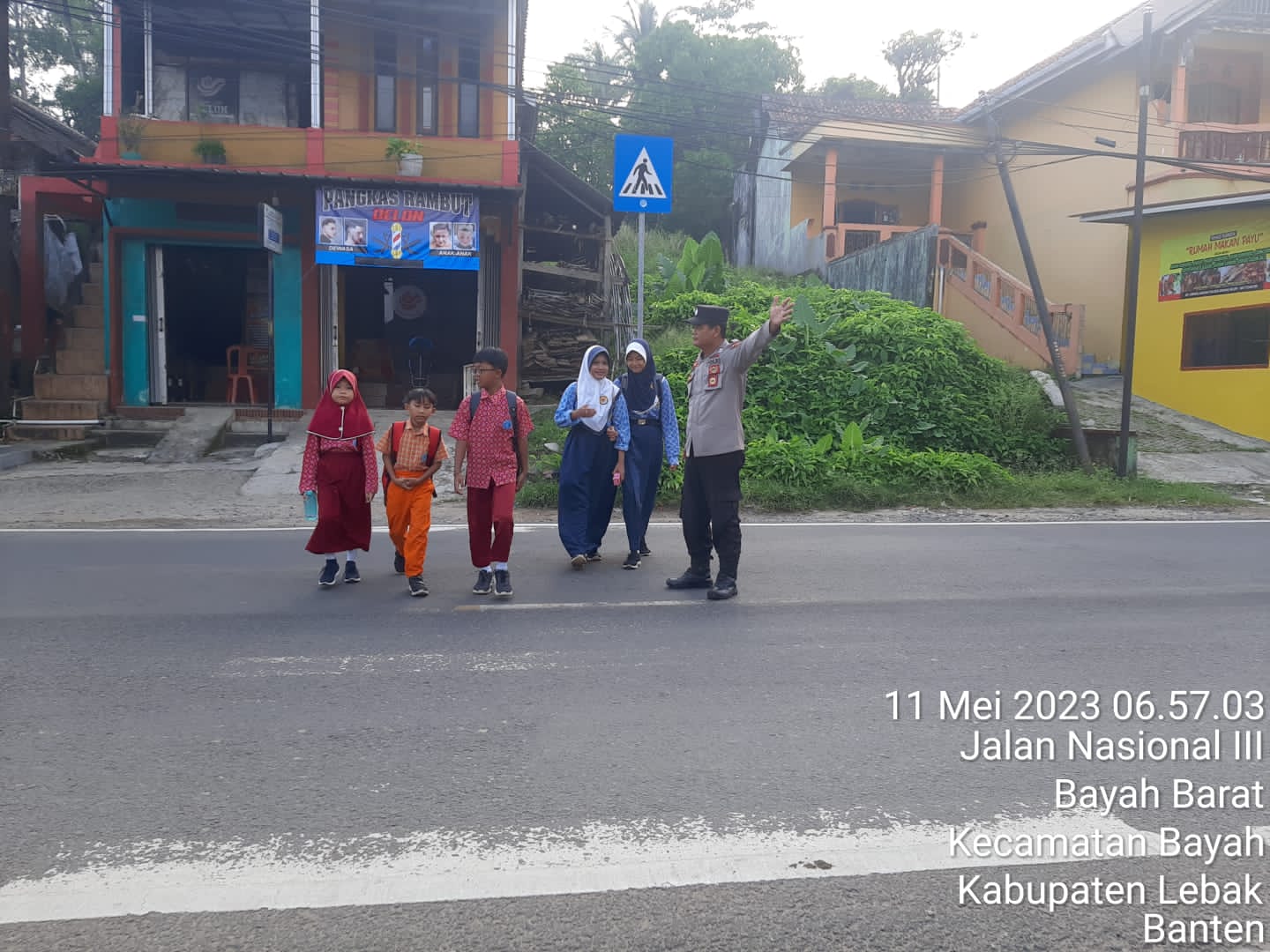 Gemasiber80news.com, LEBAK – Guna memberikan Pelayanan di pagi hari Jajaran Polsek Bayah Polres Lebak Bripka Sutardi selaku Kanit Binmas serta KSPK Bripka Aminudin peduli akan keselamatan di jalan raya dengan membantu menyebrangkan anak Sekolah Dasar ketika akan memasuki sekolah yang bertempat di SDN 4 Bayah Barat yang berada di Jalan Raya Malingping-Bayah, kecamatan Bayah, Kabupaten Lebak. Kamis pagi (11/5/2023).