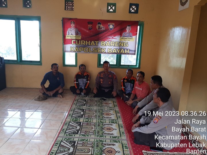 Gemasiber80news.com, LEBAK – Dalam rangka mendukung Program Kapolri yaitu Jum’at Curhat Kapolsek Bayah Polres Lebak Iptu Samsu Riyanto Didampingi Kanit Binmas Bripka Sutardi beserta Anggota Polsek Bayah Polres Lebak melaksanakan kegiatan jumat curhat sekaligus berikan himbauan Kamtibmas. Jum’at (19/5/2023) pagi.