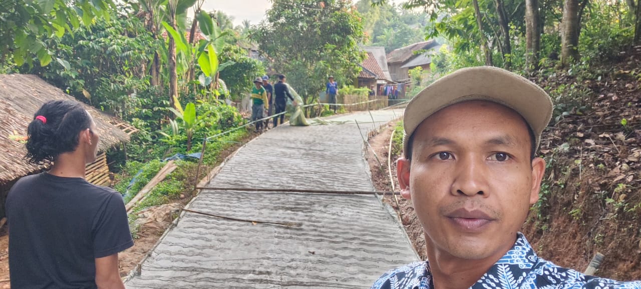 Foto : Kepala Desa Lebak Peundeuy, Jahid sedang di lokasi pembangunan jalan lingkungan.