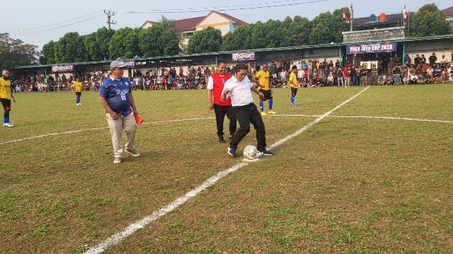 Gemasiber80news.com, TANGERANG – Penjabat Gubernur Banten Al Muktabar kick off (sepak awal) partai final Open Tournament Paku Jaya Cup VIII Tahun 2023 di Stadion Mini Kelurahan Paku Jaya Kecamatan Serpong Utara Kota Tangerang Selatan, Minggu petang, (16/7/2023). Laga Final Paku Jaya Cup VIII menyajikan pertandingan Arka Mandiri FC dari Cikupa Kabupaten Tangerang Banten melawan Dejan FC dari Kota Depok Jawa Barat.