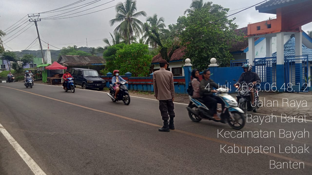 Gemasiber80news.com, LEBAK – Guna mewujudkan situasi arus lalu lintas di Jalan raya agar tetap berjalan aman dan lancar Jajaran Polsek Bayah Polres Lebak laksanakan kegiatan pengaturan lalu lintas tepatnya di jalan Simpang Terminal Bayah desa Bayah, Bayah Barat, kecamatan Bayah, Kabupaten Lebak, Provinsi Banten. Selasa (4/7/2023).