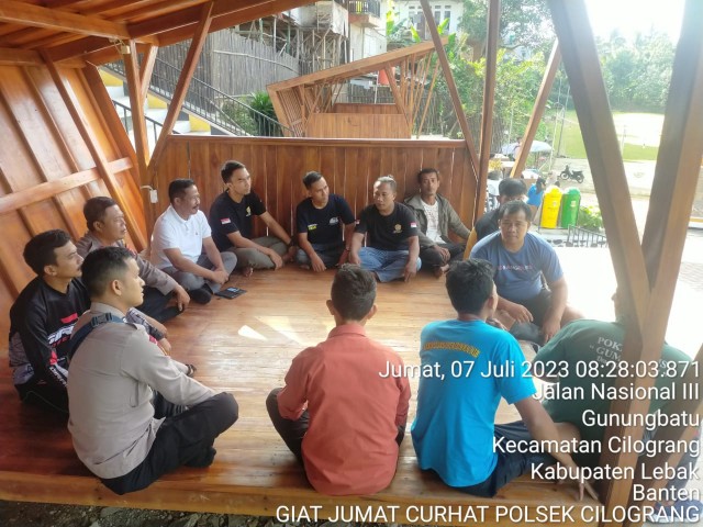 Gemasiber80news.com, LEBAK – Menindak lanjuti perintah Bapak Kapolri terkait pelaksanaan program prioritas Kapolri dimana anggota Polri diharapkan dekat dan mengerti akan permasalahan warga serta dapat menjadi problem solving, sekaligus menjalin tali silaturahmi dengan Tokoh Agama dan Tokoh Masyarakat, maka Kapolsek Cilograng Polres Lebak AKP Asep Dikdik menindak lanjuti perintah pimpinan tersebut dengan menggelar program *”JUM’AT CURHAT”* bersama Camat Cilograng, Kades Gunungbatu dan Karang taruna Desa Gunungbatu Kecamatan Cilograng, Kabupaten Lebak, Jum’at (7/7/2023).