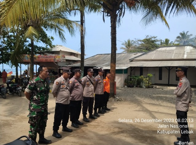 Gemasiber80news.com, LEBAK – Guna untuk pengecekan personil yang melaksanakan kegiatan pengamanan Kapolsek Panggarangan Polres Lebak Iptu Suherli Setiawan, pimpin apel pagi di Wisata Pantai Kalapa Warna dalam rangka Ops Lilin Maung Pengamanan Natal 2023 dan tahun Baru 2024, di Pos Pam Wisata Pantai Kalapa Warna. Selasa (26/12/2023)