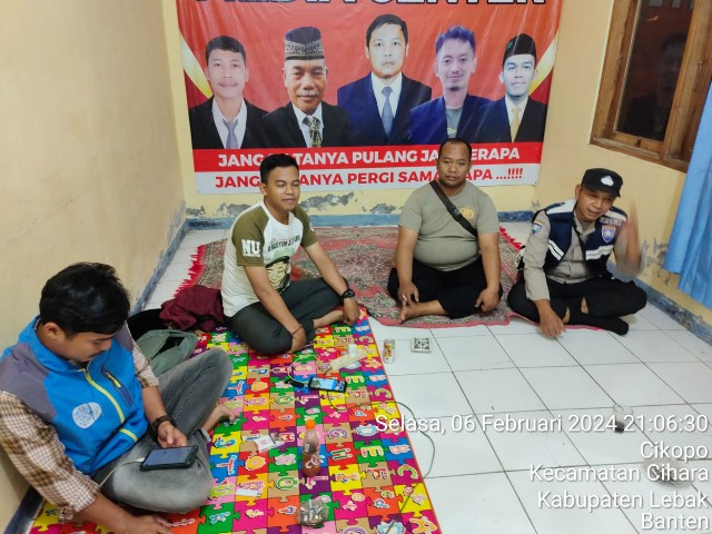 Gemasiber80news.com, LEBAK – Guna menciptakan situasi Kamtibmas yang kondusif jelang pemilu 2024, personil Polsek Panggarangan Polres Lebak Aiptu Cecep Rakhmat Hidayat, Bripka Sigit Dwi Purnomo dan Briptu Rokhim, melaksanakan kegiatan Patroli dialogis dalam rangka Cooling Sistem Jelang Pemilu 2024, ke PPK kecamatan Cihara, Kabupaten Lebak, Banten. Selasa malam (6/2/2024).