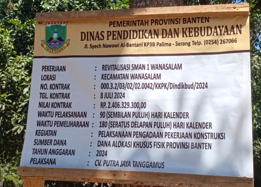 Menurut informasi yang diterima, adapun Bangunan yang bersumber dari dana alokasi khusus fisik provinsi Banten, mendapat anggaran sebesar Rp 2.406.329.300,00 yang di kerjakan oleh CV. Putra Jaya Tanggamus.