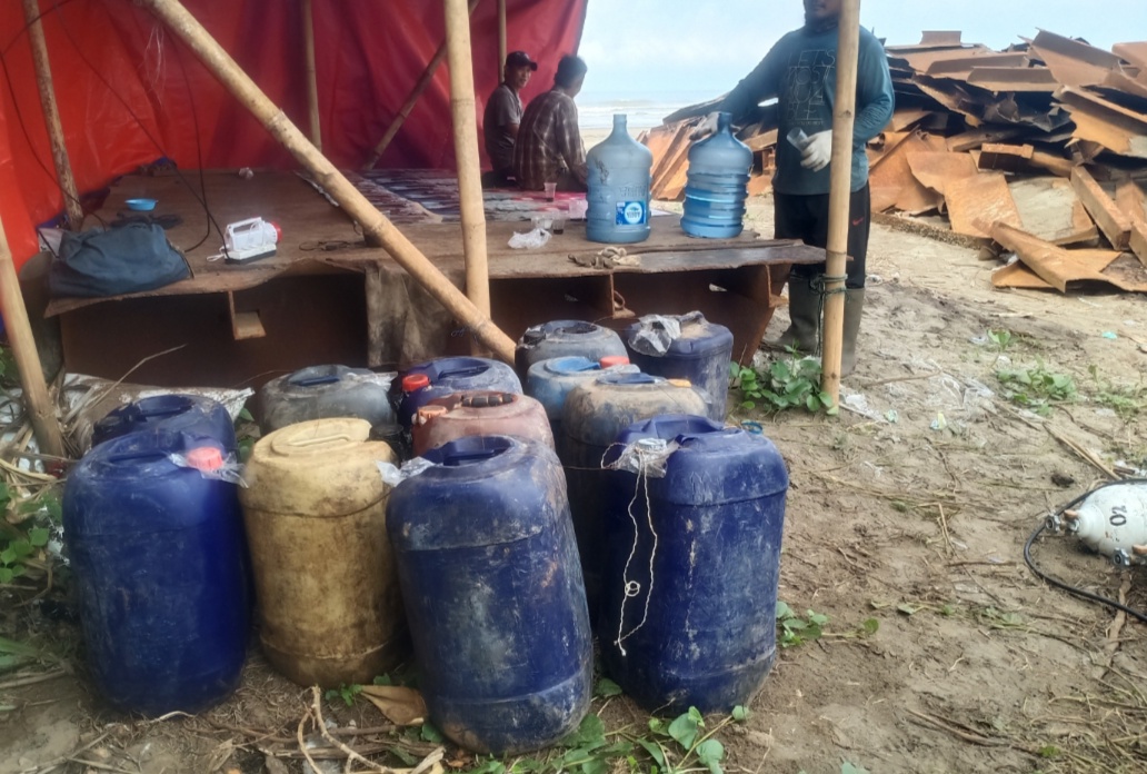 Pantauan awak media di lokasi pemotongan tongkang nampak potongan-potongan besi tongkang menumpuk dan juga ditemukan 12 jerigen berisi solar., saat dikonfirmasi pekerja yang ada dilokasi membenarkan solar tersebut,tetapi tidak tahu siapa pengirimnya.*(Deni/Irwan)