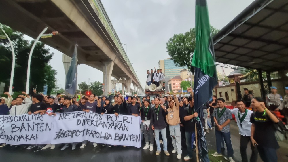 Massa aksi menyerukan evaluasi menyeluruh terhadap institusi tersebut, bahkan mendesak pencopotan Kapolda Banten jika terbukti gagal menjaga integritas Polri.