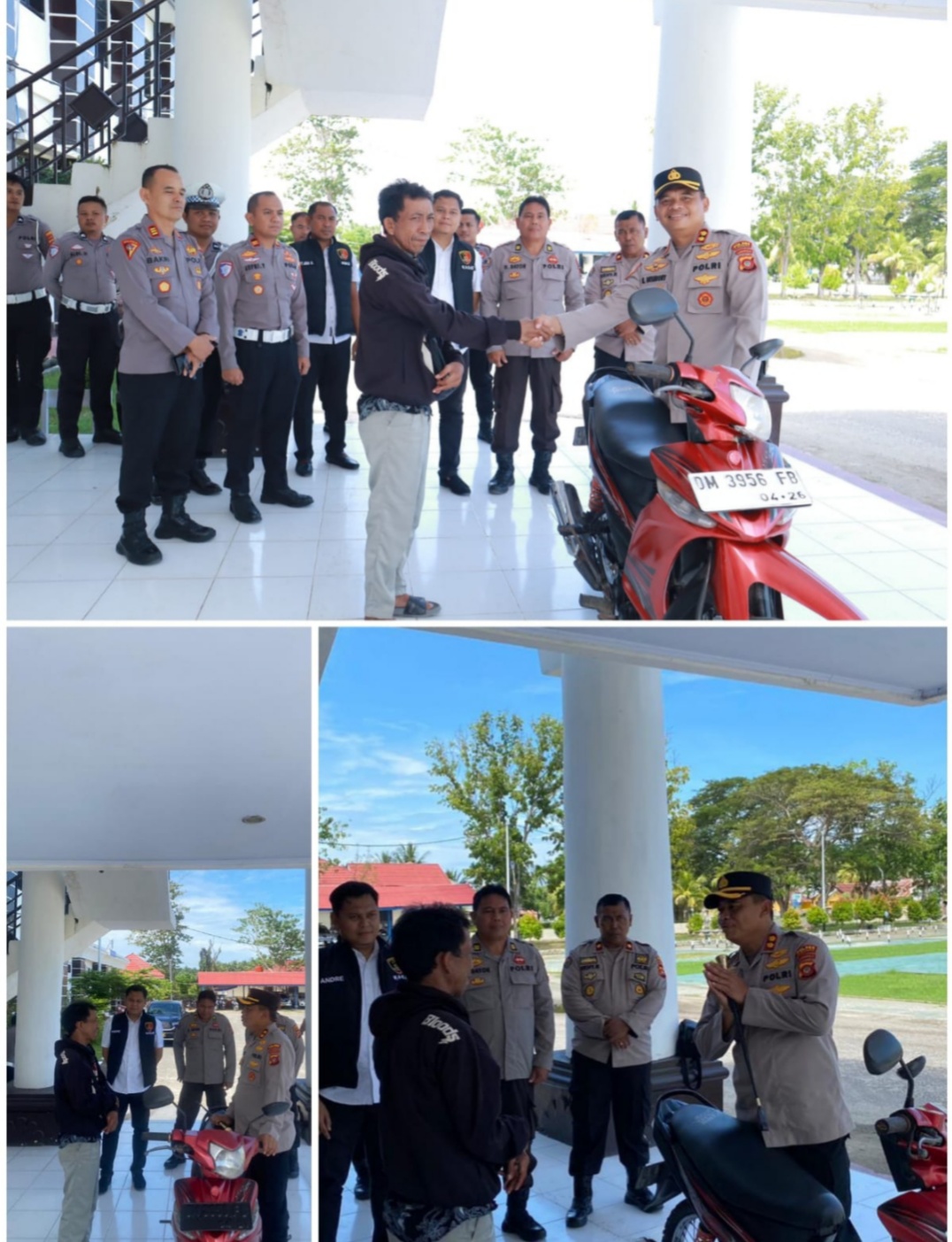 Gemasiber80news.com,POHUWATO – Wujud kepedulian terhadap korban Kapolres Pohuwato AKBP H. Busroni, S.I.K., M.H,. menyerahkan 1 unit bantuan sepeda motor merk Yamaha Vega kepada Korban Tindak Pidana Premanisme Pemerasan dan Pembakaran yang terjadi di Dambalo Kecamatan Popayato, Rabu (28/5/2025).