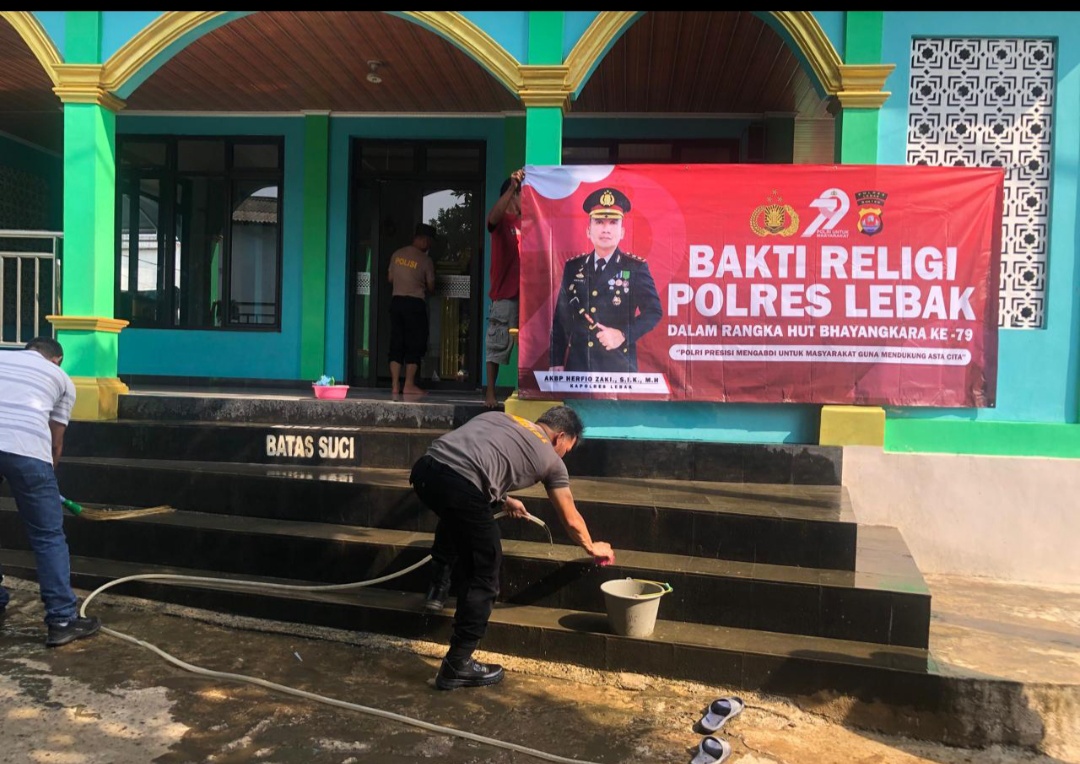 Gemasiber80news.com,LEBAK – Dalam rangka menyambut Hari Bhayangkara ke-79, Polsek Warunggunung Polres Lebak Polda Banten menggelar kegiatan melaksanakan bakti sosial/ religi berupa pembersihan atau kurve tempat/sarana ibadah mesjid, Sabtu, (14/6/2025).