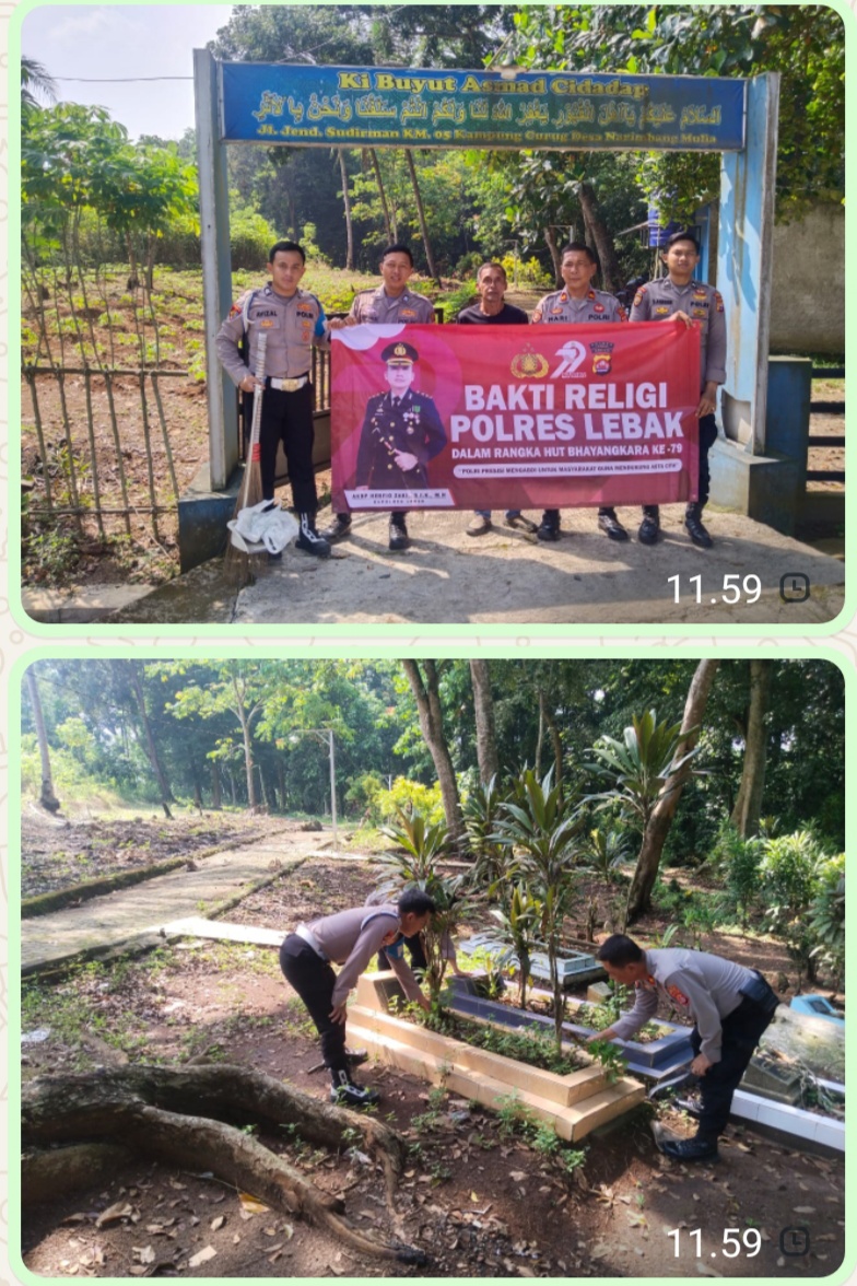 Gemasiber80news.com,LEBAK – Dalam rangka menyambut Hari Bhayangkara ke-79, Polres Lebak Polda Banten menggelar kegiatan melaksanakan bakti religi berupa bersih-bersih Makam/Tempat Pemakaman Umum (TPU) Cidadap Desa Narimbang Mulya kecamatan Rangkasbitung Sabtu, (14/6/2025).