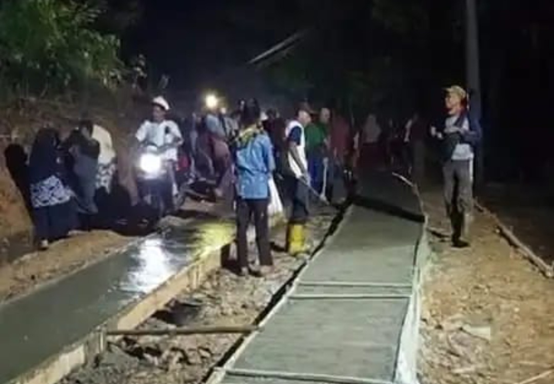 Aksi perbaikan jalan dengan coor beton tersebut dilakuan pada Selasa 22 Juli 2025 malam melalui gotong-royong warga setempat.