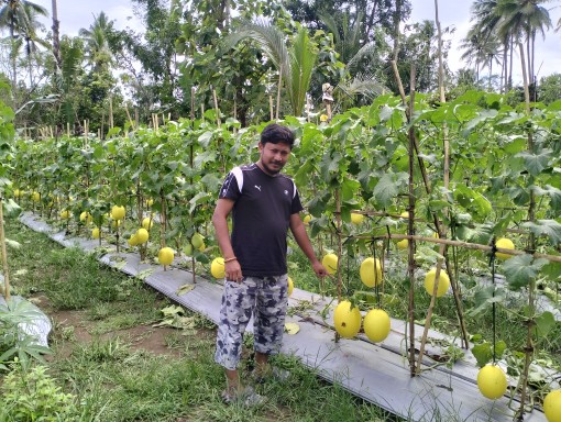 H Imam Taufik, yang tidak lama lagi akan panen Melon Alisa yang biasa disebut Melon Madu, memberikan contoh tanamannya yang maksimal.