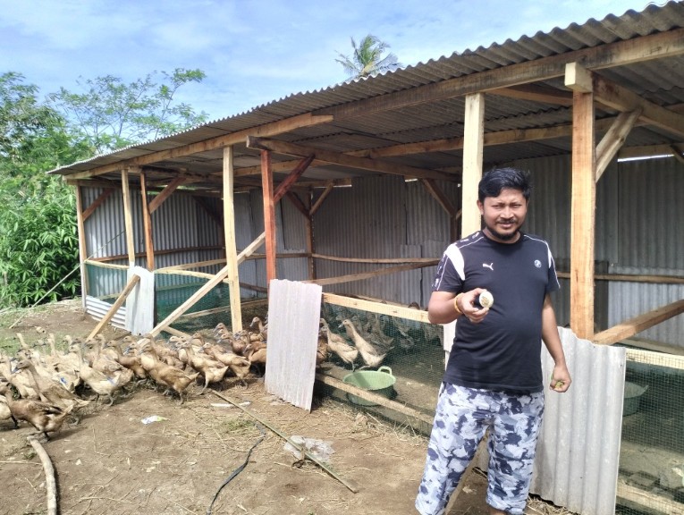 Selain itu, baru tiga hari ini beternak bebek petelur dengan jumlah 180 ekor, pada hari pertama berhasil mendapat telur sebanyak 70 butir, hari kedua 60 butir karena bebek dalam keadaan masih stres, hari ini telur belum dihitung.