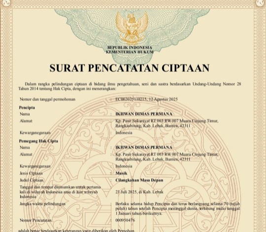 Gemasiber80news.com, LEBAK – Lagu “Cilangkahan Masa Depan”, tercatat resmi di Kementerian Hukum dan HAM Direktorat Jenderal Kekayaan Intelektual (DJKI) dengan Nomor 000950476, tertanggal 12 Agustus 2025. Sertifikat yang ditandatangani Direktur Hak Cipta dan Desain Industri, Agung Damarsasongko, SH., MH.