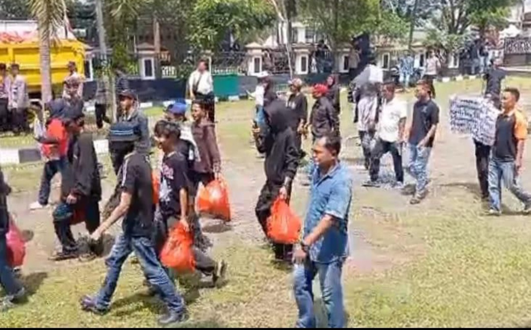 Gemasiber80news.com,PANDEGLANG – Perwakilan warga Bangkonol, Kecamatan Kroncong, Kabupaten Pandeglang melakukan aksi protes ke Kantor Dinas Lingkungan Hidup (DLH) Pandeglang dengan membawa kantong plastik berisikan sampah.