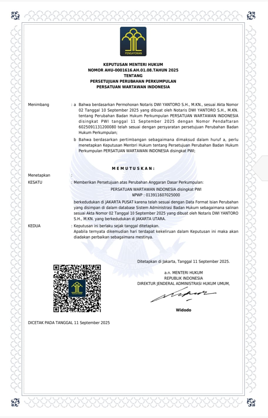 Penerbitan AHU PWI itu berdasarkan permohonan PWI Pusat hasil Kongres Persatuan PWI yang disampaikan kepada Kemenkum melalui permohonan Notaris Dwi Yantoro SH MKn, sesuai Akta Nomor: 02 Tanggal 10 September 2025 yang dibuat oleh notaris tentang Perubahan Badan Hukum Perkumpulan PWI tanggal 11 September 2025 dengan Nomor Pendaftaran: 6025091131200080 telah sesuai dengan persyaratan persetujuan perubahan badan hukum perkumpulan.