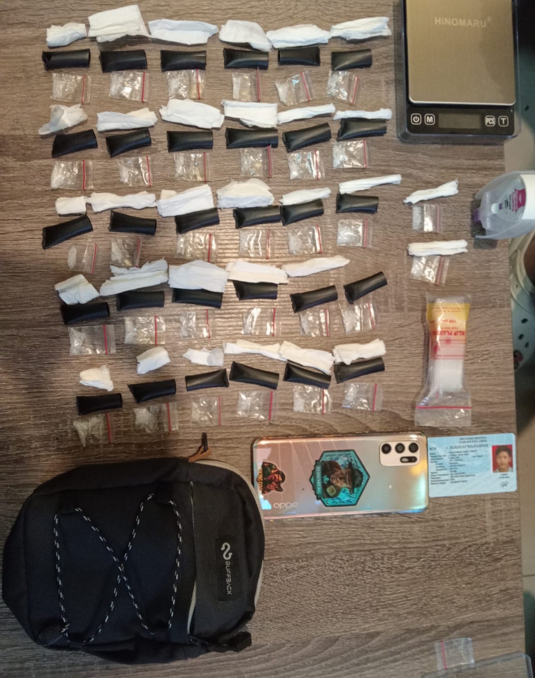 1 (satu) buah tas selempang warna hitam, 32 (tiga puluh dua) bungkus plastik klip bening berisikan kristal putih yang diduga narkotika golongan I jenis sabu dengan berat brutto 9,04 gram dan berat netto 5,84 gram, 1 (satu) unit timbangan digital merek Hinomaru, 1 (satu) unit handphone merek OPPO warna gold,” ungkapnya.