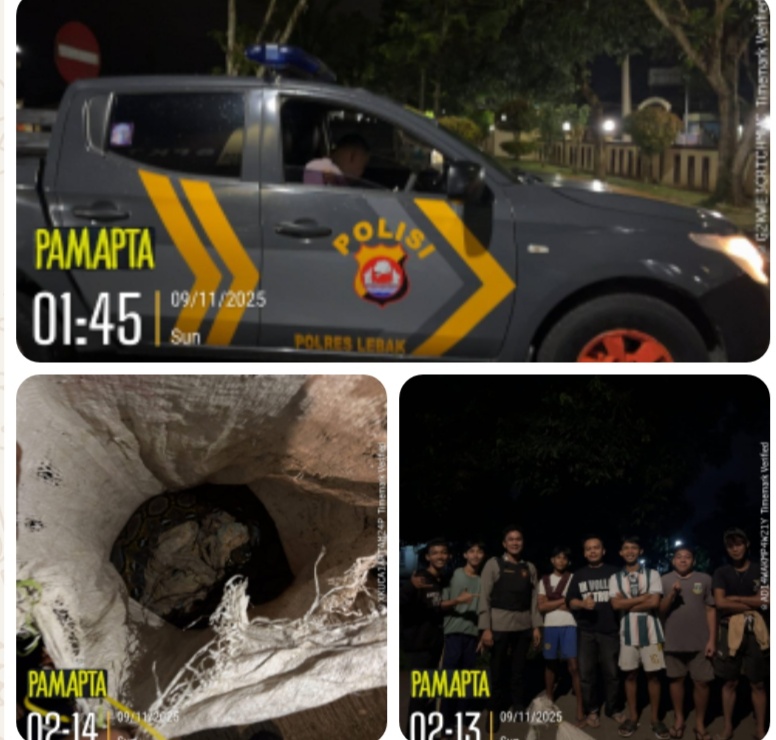 Gemasiber80news.com,LEBAK – Respon cepat terhadap laporan masyarakat melalui layanan Call Center 110, personel Pamapta Polres Lebak Polda Banten berhasil mengevakuasi seekor ular piton yang masuk ke pekarangan rumah warga di Kampung Pasir Kuntul, Desa Cisangu, Kecamatan Cibadak, Kabupaten Lebak, Minggu (9/11/2025) dini hari.