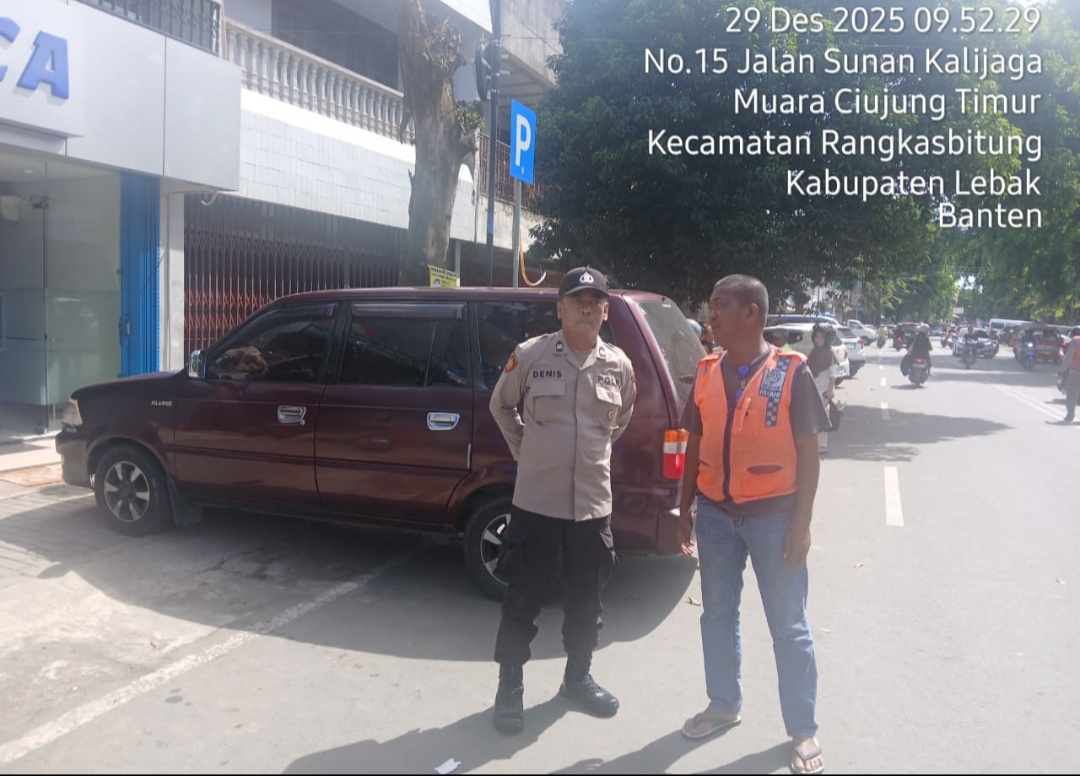 Gemasiber80news.com,LEBAK– Jelang Nataru 2026,Pastikan aman dalam rangka menjaga harkamtibmas,anggota Polsek Rangkasbitung,AIPTU Terry.MS dan AIPTU Deni.S,sekaligus cek tempat parkir di depan Bank BCA Rangkasbitung.Senin (29/12/2025)