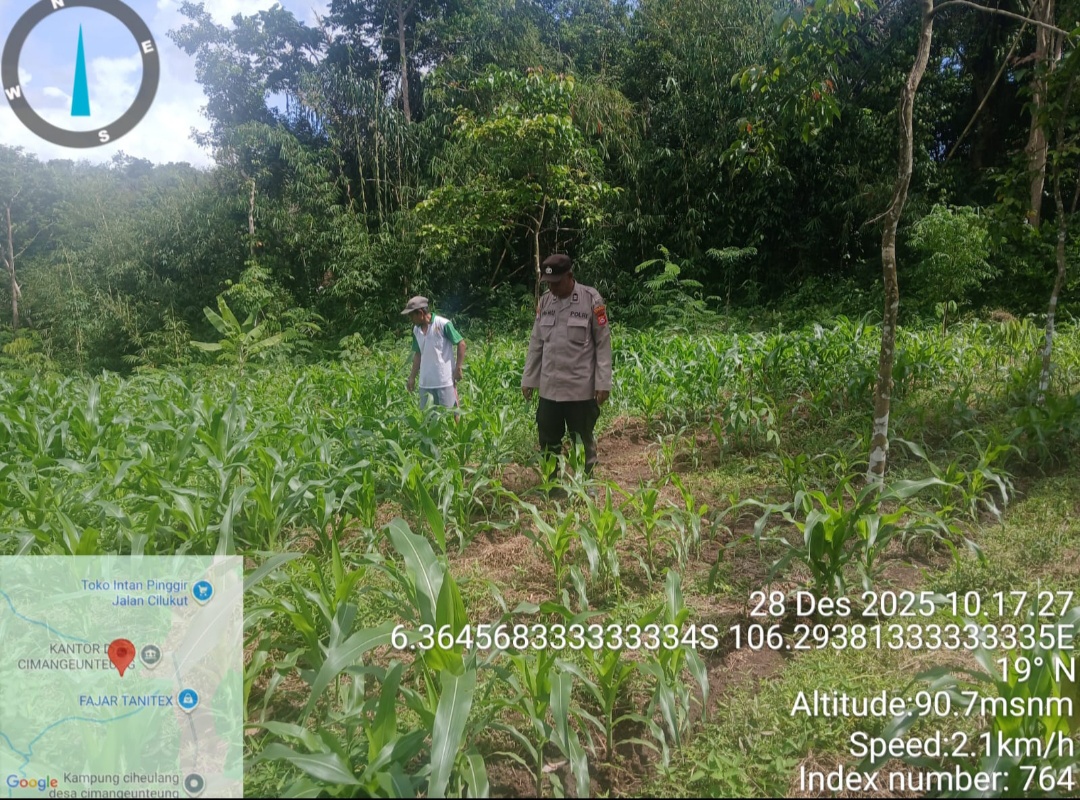 Gemasiber80news.com,LEBAK – Mendukung program Ketahanan Pangan,Kait Binmas Polsek Rangkasbitung Polres Lebak,AIPTU Heru Sasmito dan kelompok tani cek bibit pohon jagung dan bersihkan rumput liar disekitaran pohon Jagung.