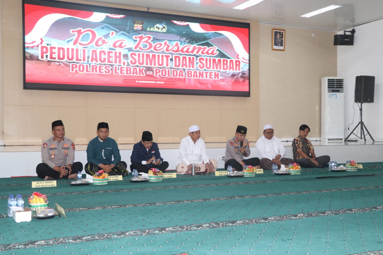 Gemasiber80news.com,LEBAK – Sebagai bentuk kepedulian dan empati terhadap para korban bencana alam di Aceh, Sumatera Utara, dan Sumatera Barat, Polres Lebak Polda Banten menggelar kegiatan Doa Bersama Peduli Aceh, Sumut, dan Sumbar yang bertempat di Aula Bawah Polres Lebak, Senin (8/12/2025) sore.
