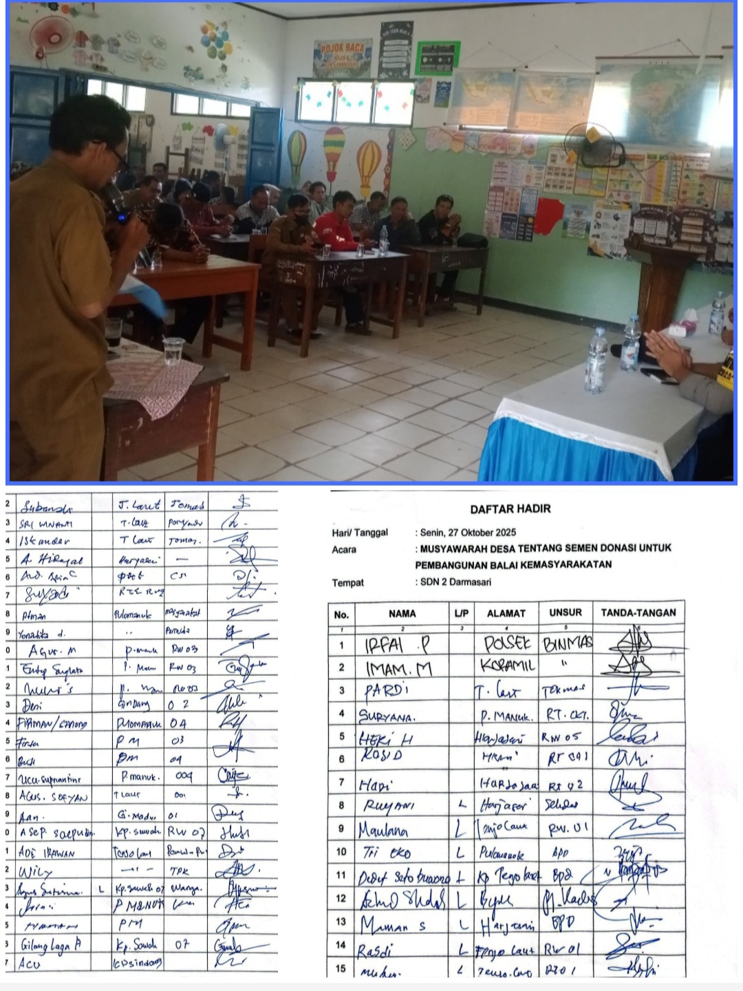 Dedet Anggota BPD mengatakan,” Mengenai semen donasi sebenarnya sudah selesai dengan digelarnya musyawarah desa yang dihadiri oleh Pj Kepala desa, Prades, BPD, Ketua RT/RW, Bhabinkamtibmas dan warga desa Darmasari pada hari Senin 27 oktober 2025, ujar Dedet.