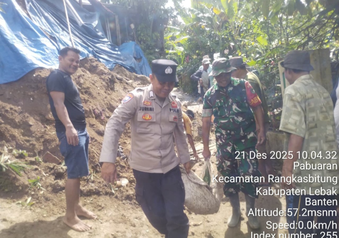Seperti halnya yang dilakukan oleh Bhabinkamtibmas Polsek Rangkasbitung, BRIPKA Juremi dan Babinsa Koramil Rangkasbitung bersama Pemerintahan Desa serta Warga turun langsung bergotong royong membersihkan material tanah dan batu yang menutupi badan jalan akibat longsor.