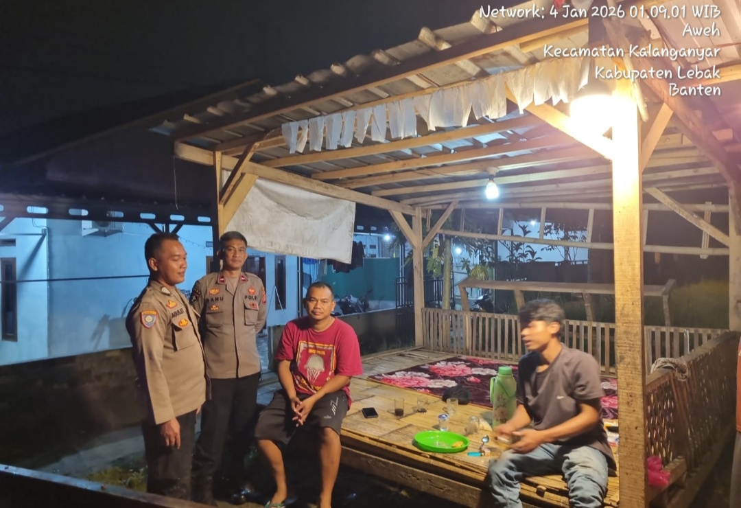 Gemasiber80news.com,LEBAK – LEBAK – Berikan rasa aman, Kspkt III Polsek Rangkasbitung AIPDA Danu Nugraha dan BRIPKA Agus St,giat patroli dialogis dan Sambangi warga di pos ronda,Kampung Situ Leutik,Desa Aweh, Kecamatan Kalanganyar, Kabupaten Lebak.Minggu pagi 04 Januari 2026,pukul.01.08 Wib.