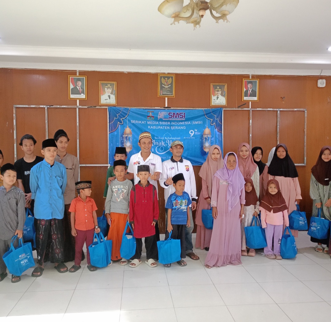 Gemasiber80news.com,SERANG – Serikat Media Siber Indonesia (SMSI) Kabupaten Serang menggelar kegiatan sosial dengan memberikan santunan kepada puluhan anak yatim di Kecamatan Kramatwatu, Kabupaten Serang, Kamis (12/3/2026). Kegiatan tersebut merupakan bagian dari rangkaian peringatan HUT ke-9 SMSI sekaligus momentum berbagi di bulan suci Ramadhan 1447 Hijriah.