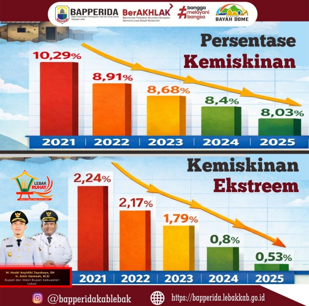 Gemasiber80news.com,LEBAK -Berdasarkan rilis Badan Pusat Statistik (BPS) Tingkat kemiskinan Kabupaten Lebak pada Tahun 2025 menurun menjadi 8,03 persen, sehingga jika dibandingkan tahun 2024 ada penurunan kemiskinan dari 8,4 persen menjadi 8,03 persen. Selain itu penurunan juga terjadi pada Miskin Ekstrim menjadi 0,53 persen dari 0,8 di tahun 2024.